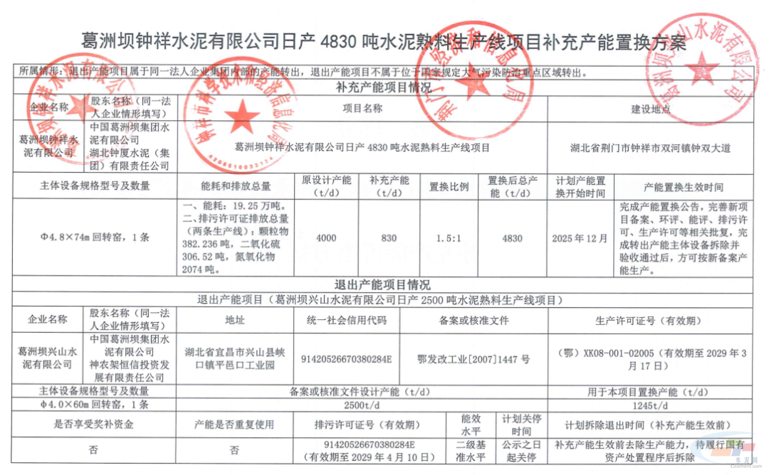 置换方案显示,葛洲坝兴山水泥退出一条2500t/d熟料生产线,其中1245t/d产能用于补充葛洲坝钟祥一条4000t/d熟料线,补齐后产能4830t/d,置换比例1.5:1;